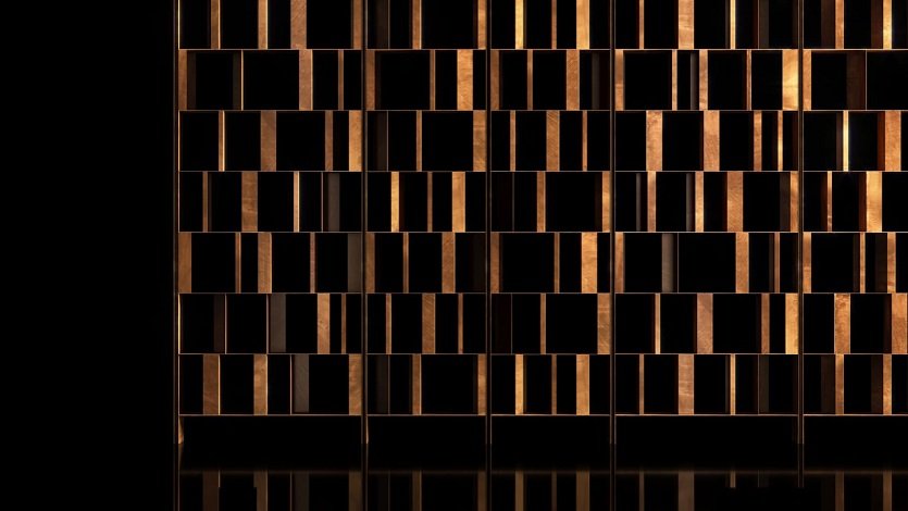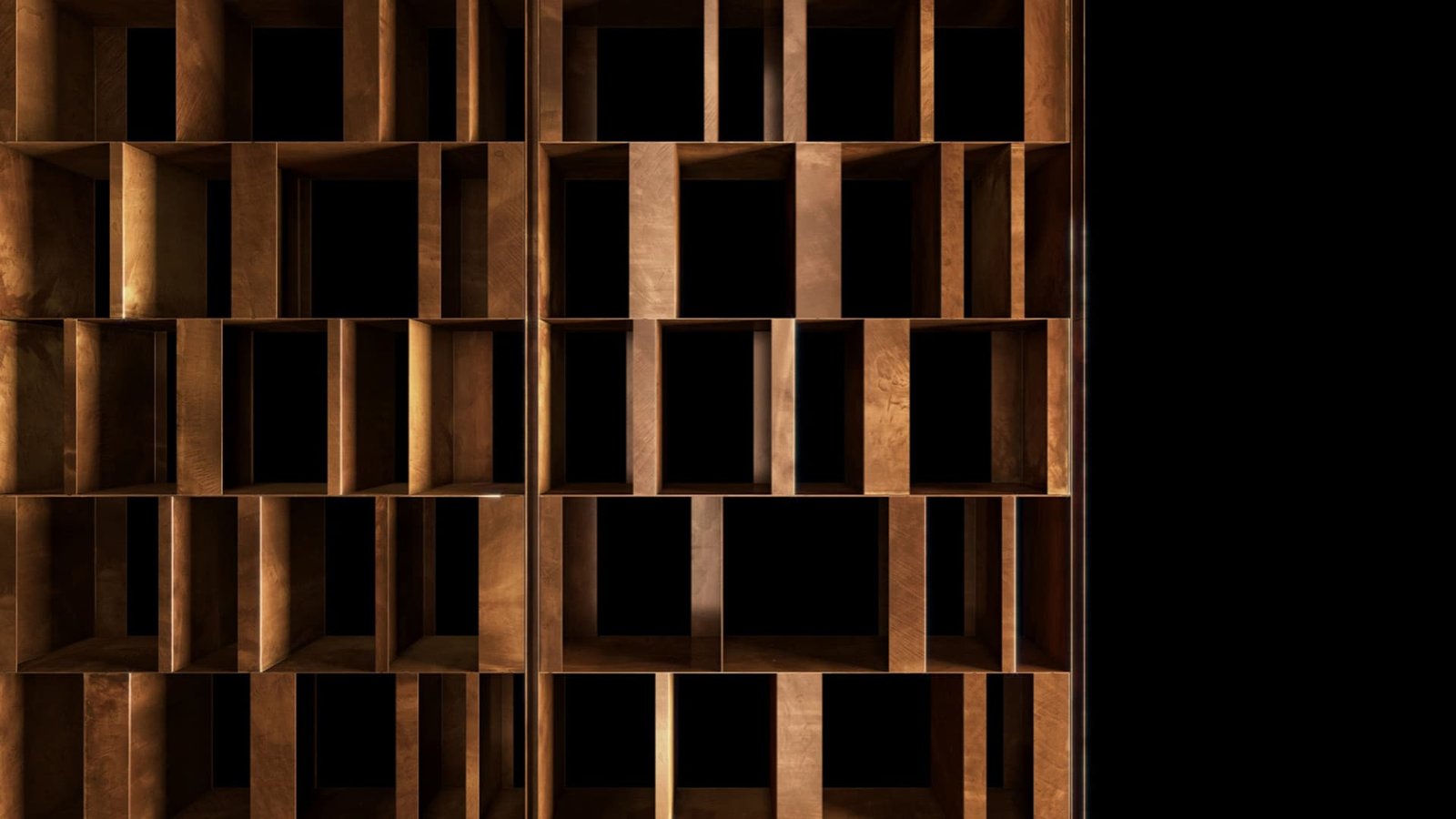 STRUCTURE External columns in 2,7 cm thick solidwood covered with metal. Internal structure 0,2 cm thick in metal. FINISH Burnished brass, black burnished brass or steel finish burnished Titanio or burnished Platino. Base and wall support in black burnished steel using traditional techniques.