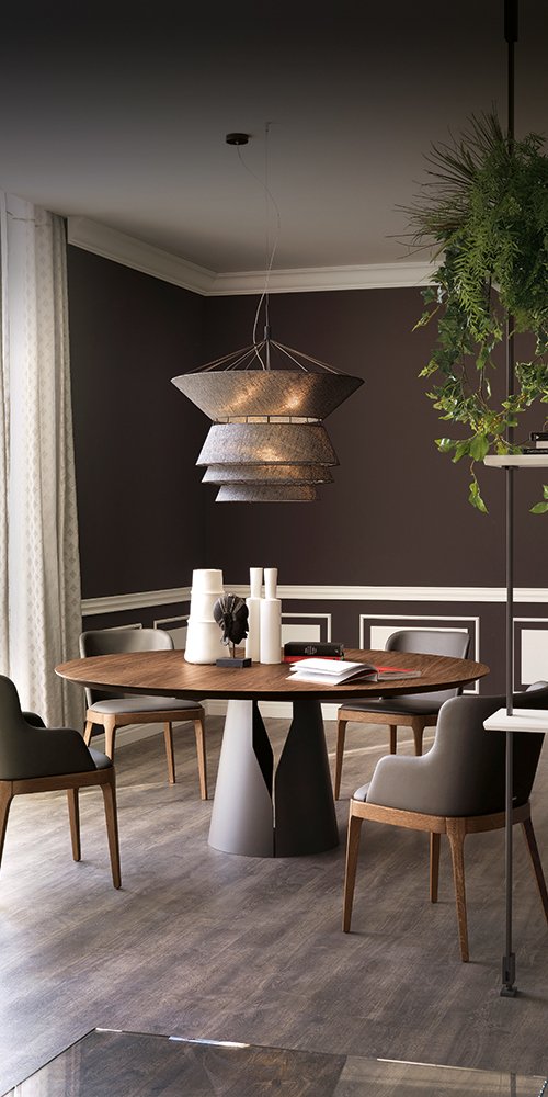 disponible en différentes formes, tailles et matériaux : la version standard est une table ronde ou ovale moderne, avec un plateau en bois ou en marbre.céramique