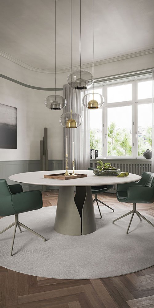 Les tables modernes donnent à la salle à manger un style contemporain et minimaliste. Une empreinte stylistique sobre avec une touche fantaisiste fait de cette table design un meuble intemporel. La base ronde en acier a une fente précise qui vous permet d'apercevoir à l'intérieur.