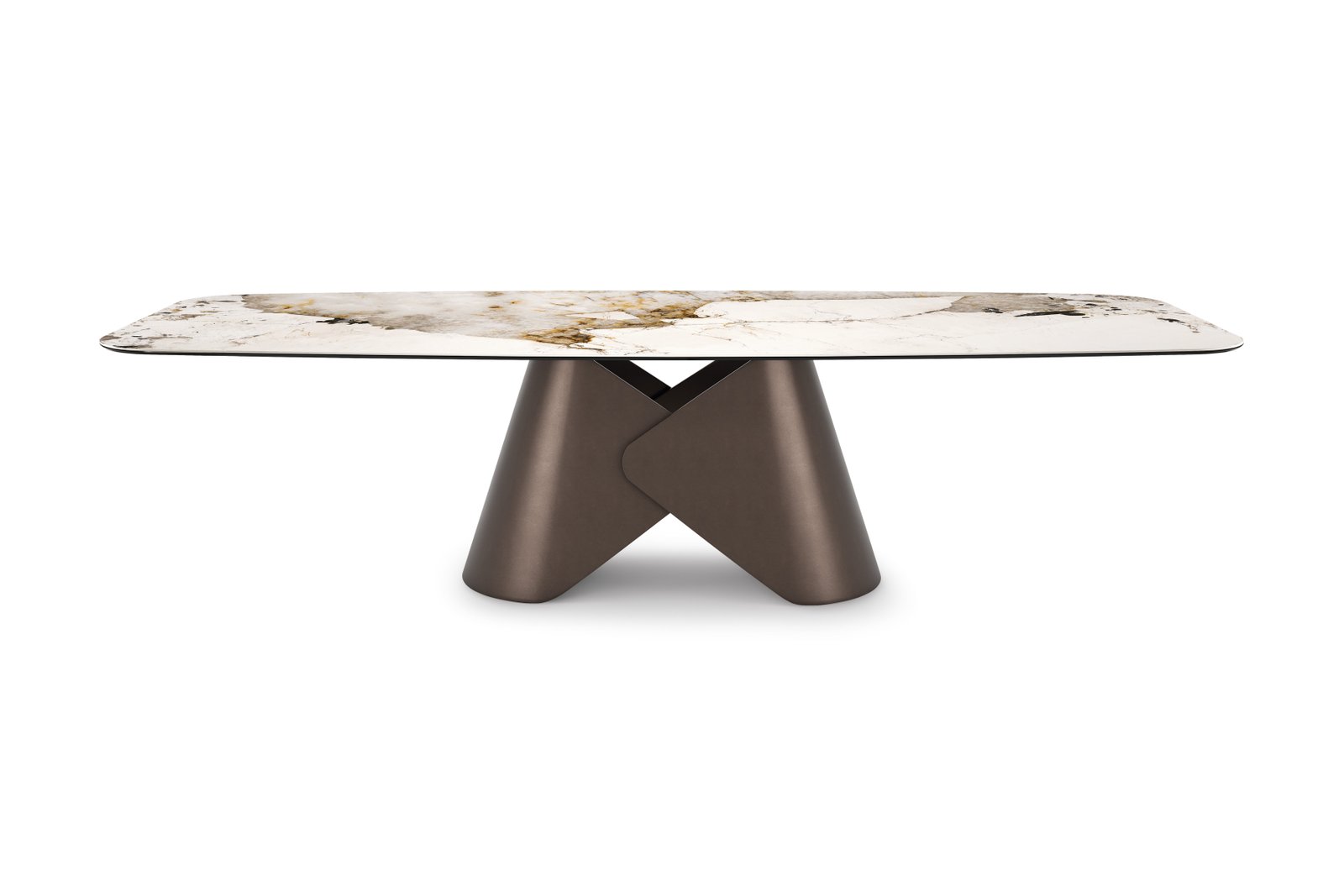 Une finition exclusive est introduite pour la base de cette table à manger moderne , spécialement conçue pour rehausser le modèle HUG. La finition en laiton oxydé Oxybrass La famille se compose de deux tables design en céramique : un élégant plateau en céramique effet marbre, disponible dans de nombreux tons fascinants pour s'adapter à une variété de goûts. Le modèle Premium est en outre agrémenté d'un bord épais à main levée dans une finition brossée.