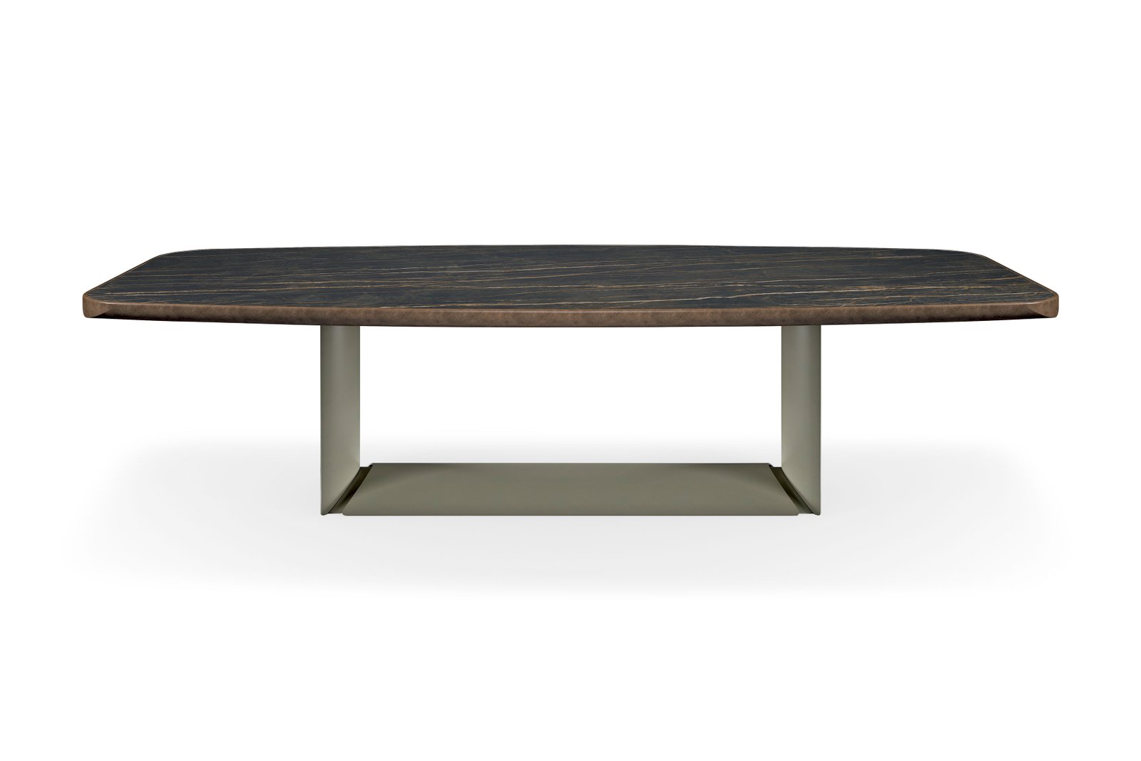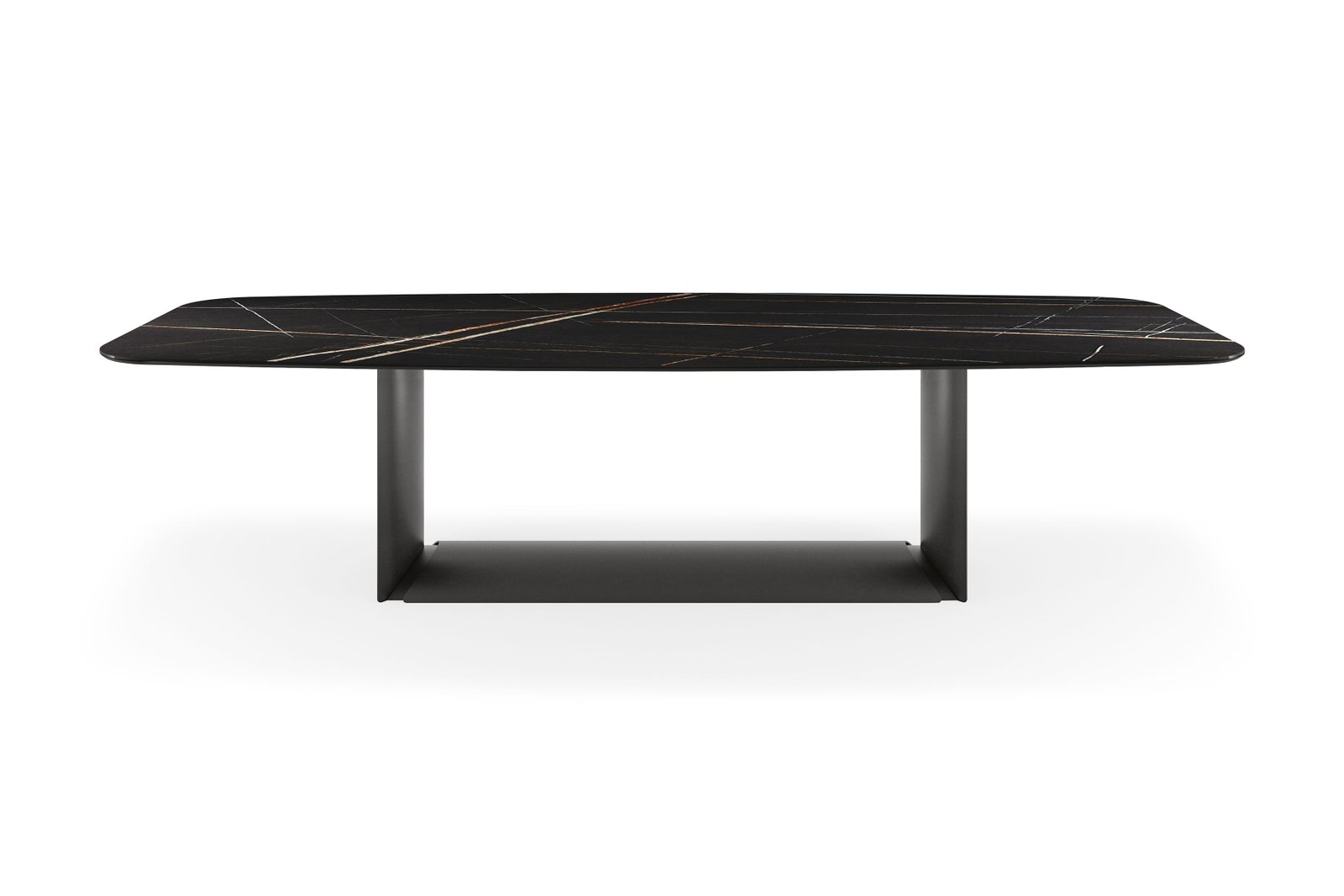 La famille de tables à manger rectangulaires Dragon est l'alliance parfaite entre bords et rondeur. La base de cette table design divise la salle à manger avec précision et grâce à la fois. La structure rigoureuse est adoucie par le bouclier courbe et le jeu de lumières qui se reflète sur la base en acier laqué.