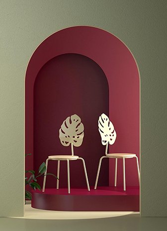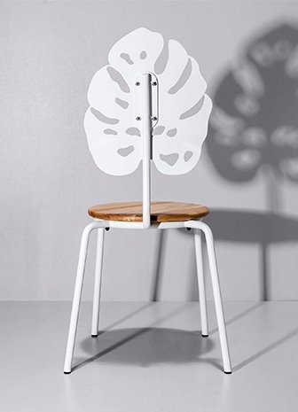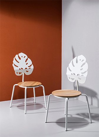 Nous avons conçu des chaises avec des éléments simples. Se concentrer sur les nuances du cintrage des tuyaux et des soudures esthétiques. Les sortir d'un contexte purement technique, dans le plan de l'esthétique. Nous avons découvert une sophistication et une poésie étonnantes que nous perdons de vue chaque jour. L'une des chaises de la ligne a un dossier en forme de feuille courbée de manière ergonomique de la plante tropicale Monstera deliciosa, qui met également l'accent sur l'idée de créer des éléments symboliques avec des outils simples. Pour les terrasses extérieures, une modification vec un siège HPL est possible