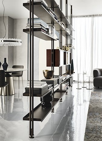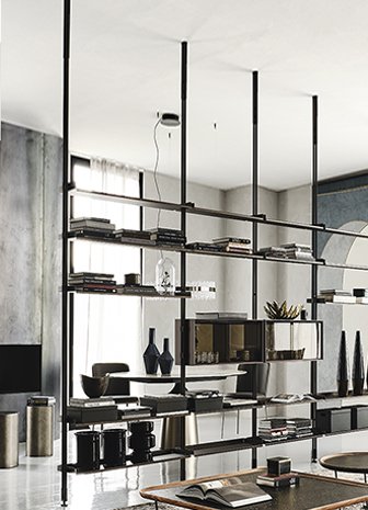 Bibliothèque à éléments avec fixation au mur ou au plafond.