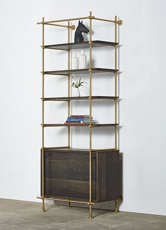 Cette version à baie unique de l'étagère de collection de Razane Design comprend des raccords et des poteaux en laiton usiné massif dans une finition en laiton chaleureux. L'unité se monte au sol et au mur pour supporter une série d'étagères facilement réglables et une crédence avec des portes en bois. Les étagères et la crédence en bois sont fabriquées à partir de chêne blanc massif fraisé en interne avant de recevoir une finition oxydée appliquée à la main qui met en valeur le caractère naturel et la beauté de ce bois d'origine locale.