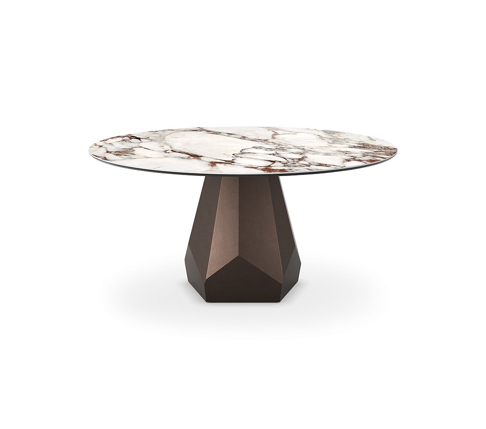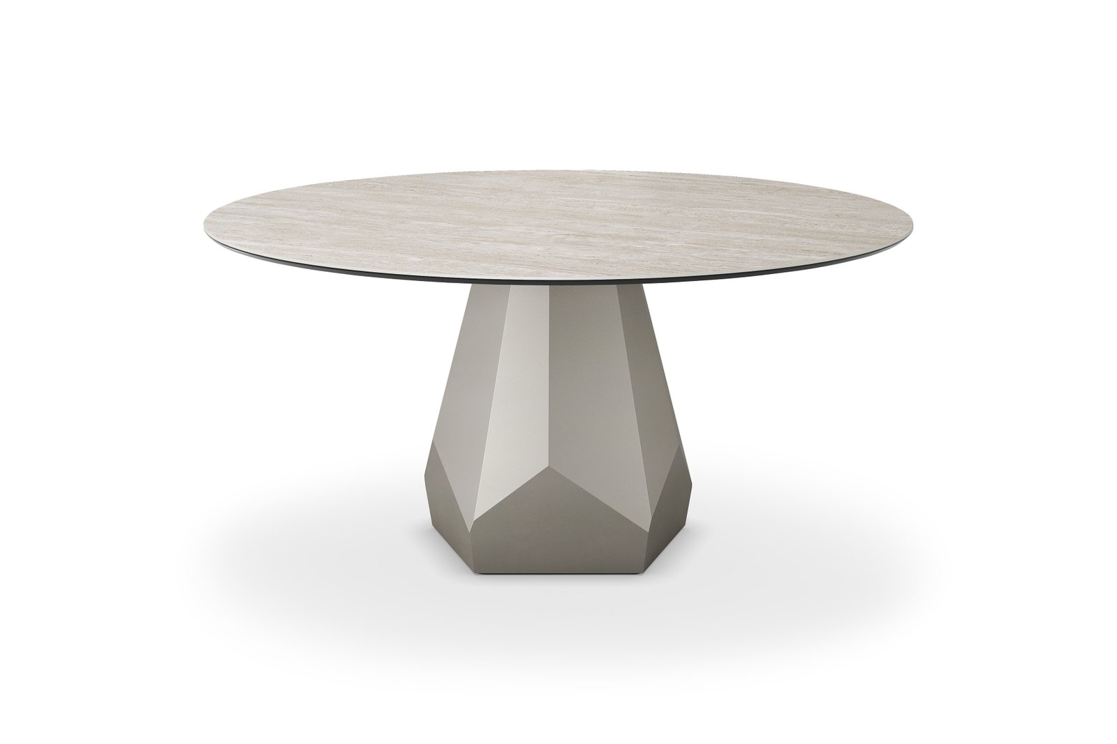 La famille de tables Zerba présente une base centrale remplie de coins et de verticales. Plus précisément, il est formé de 15 côtés qui se répètent autour de la colonne centrale avec une précision géométrique. Chaque côté de ce prisme semble être d'une couleur différente, car la lumière est réfléchie avec une intensité variable selon l'angle.